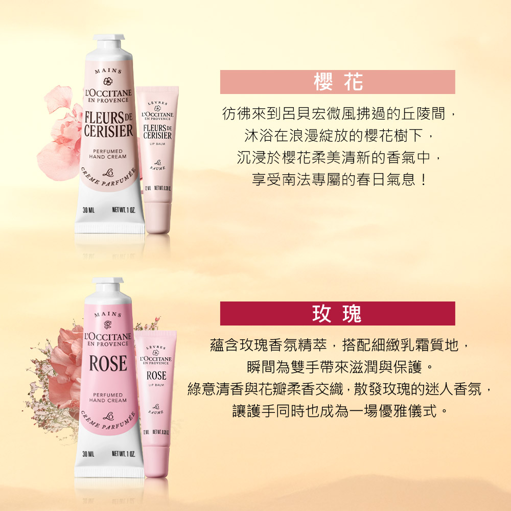 L'OCCITANE櫻花系列是為了慶祝春天美麗的白色櫻花,她在春天盛開並只能維持幾天花期! 低溫萃取技術.擷取獨特天然精萃 L'OCCITANE自呂貝宏(Luberon)地區以人工採摘嬌柔櫻花,每7000朵珍貴櫻花,僅能獲得1公升的櫻花花露。再以低溫萃取技術,擷取珍貴的櫻花香氣,捕捉天然香氛因子,細細感受於繽紛花雨中慶祝大地復甦的美好。