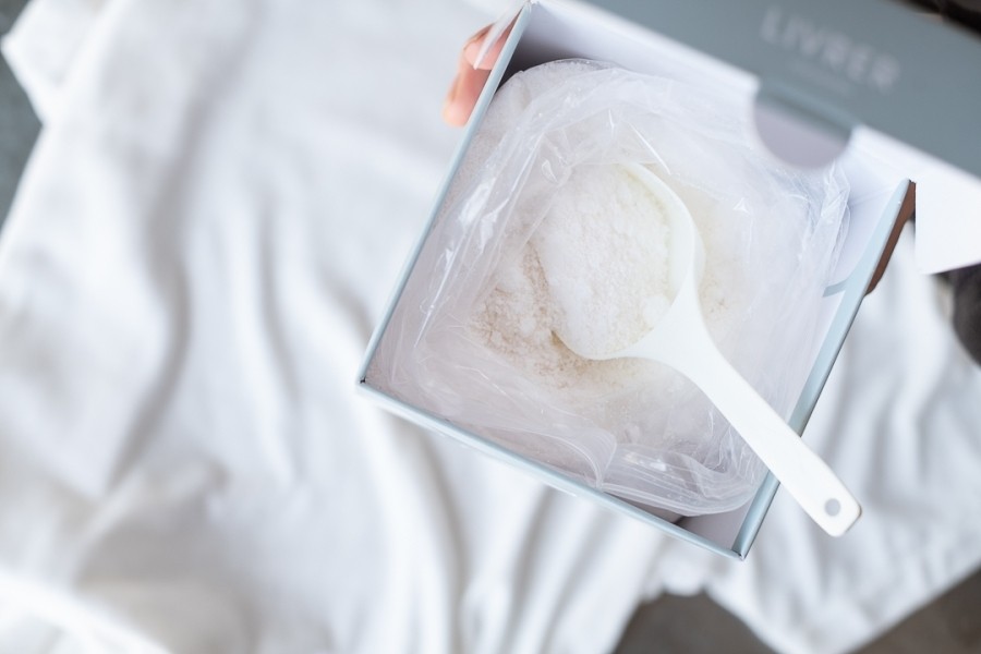 LIVRER 專為白色衣物研發的專用粉狀洗劑。以洗淨力優越的藥皂為基底,嚴選各種去污效果佳的洗淨成分混合而成。