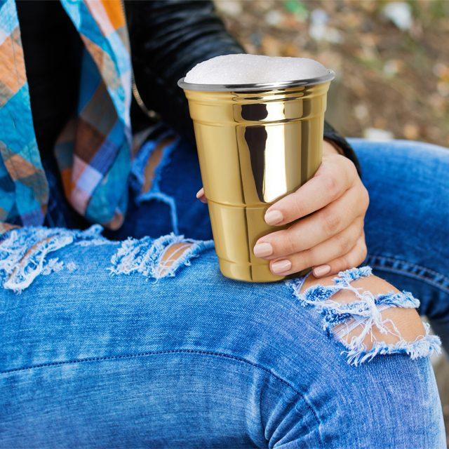 這款經典造型派對杯可以裝進 16 盎司的飲料,材質為不銹鋼外層銅包覆著。可重複使用,節約節能,派對可以很炫也不忘愛地球!