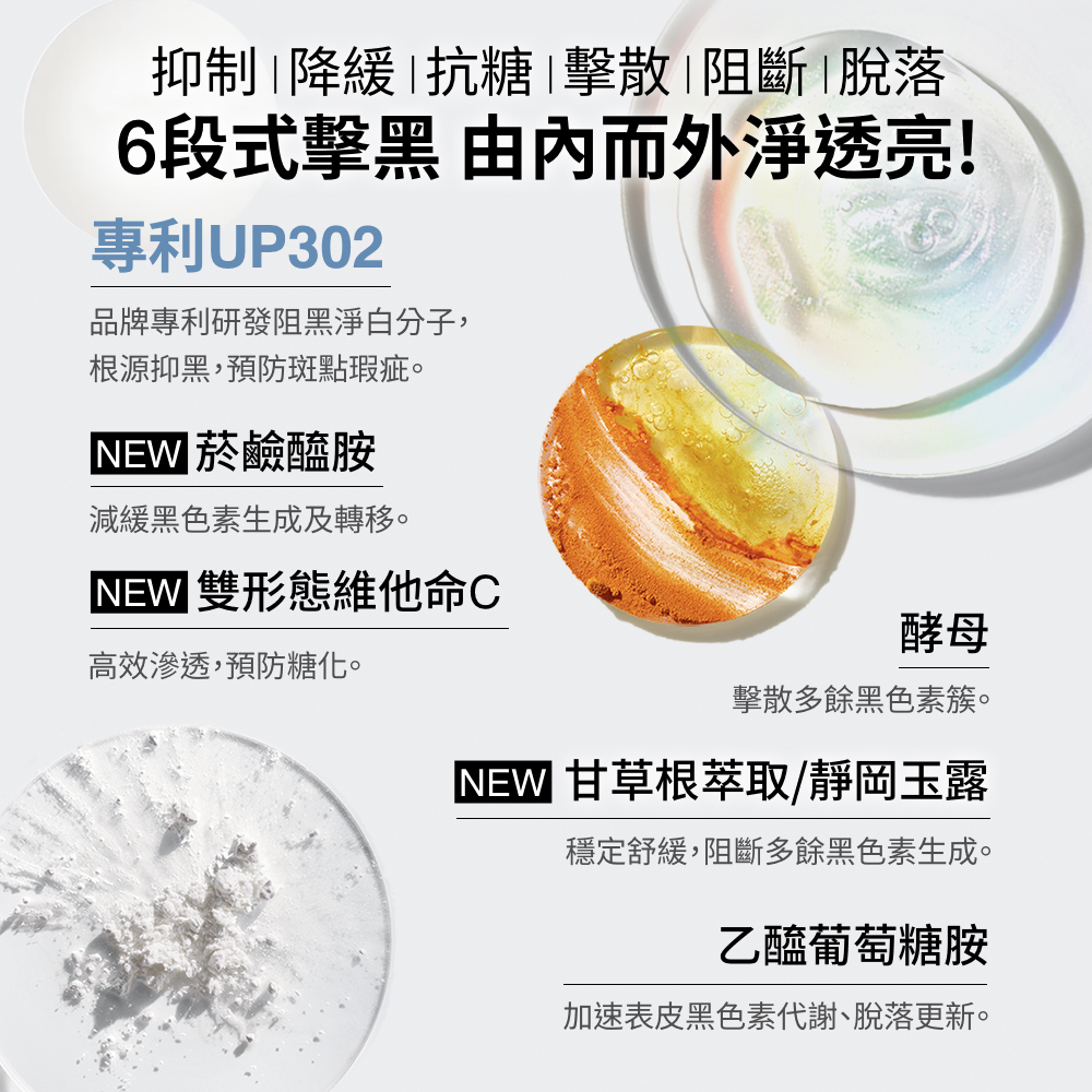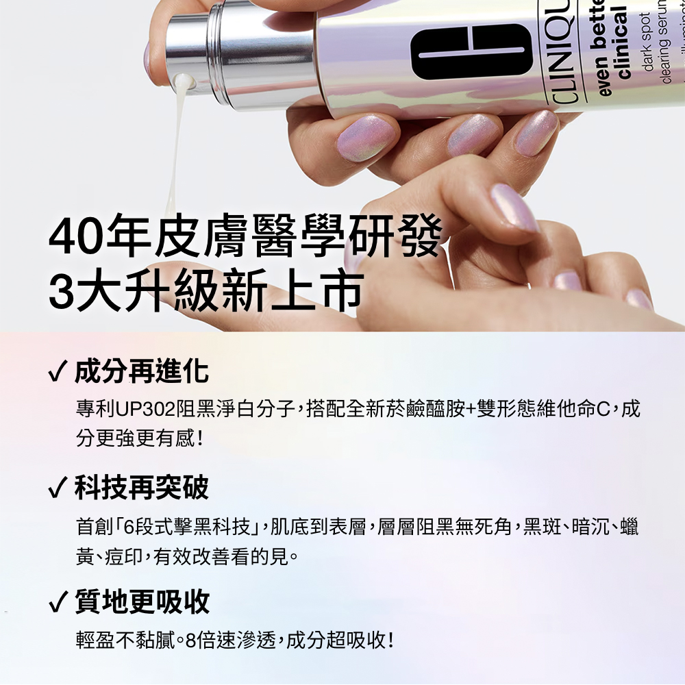 全球第一皮膚科醫生品牌,皮膚科學研究室研發,CL302勻亮科技結合讓肌膚能夠溫和代謝老廢角質,勻淨斑點,穩定肌底,亮白有感,肌膚由裡而外的淨、透、亮。 添加靜岡綠茶萃取,溫和不致敏,清爽不致痘,業界唯一修護型淡斑精粹。