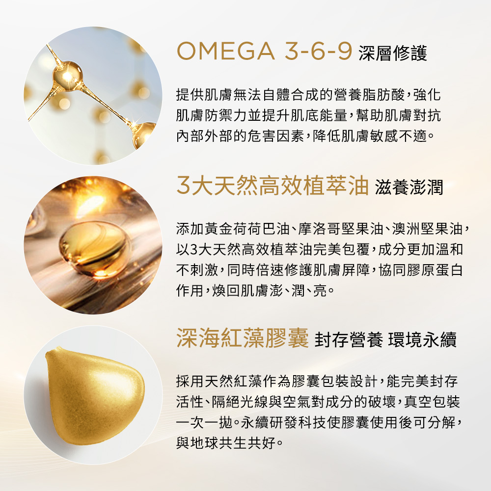 蘊含維他命A醇及複方植物油等高效成分,煥新肌膚、協同膠原蛋白作用,保持肌膚健康狀態,同時修正膚色不均等煩惱,全面對抗初期各種老化現象。配方溫和不易刺激,使用後肌膚不會乾燥脫皮,全臉及眼周皆適用。