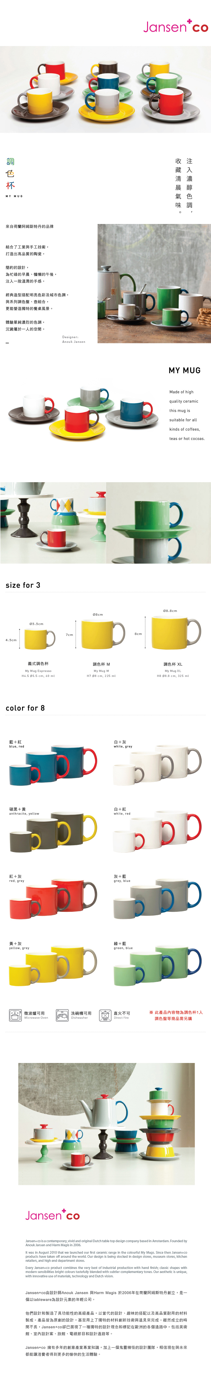 ※ 此產品內容物為調色杯1入,調色盤等配件需另購 ※ ※ 此產品內容物為義式調色杯1入,調色盤等配件需另購 ※ 注入濃醇的色調,收藏一杯清晨的氣味來自荷蘭阿姆斯特丹的品牌,採用1200度高溫燒製,純手工著色與雙層釉料塗佈,兼具美觀與耐用,完美結合了工業與手工技術,極力打造出最高品質的瓷器。簡約的設計,為忙碌的早晨、慵懶的午後注入一股溫潤的手感。經典造型搭配明亮色彩及城市色調,與系列調色杯、盤、壺組合,更能營造獨特的餐桌風景,體驗單純濃烈的色調,沉澱屬於一人的空間。商品規格品名:Jansen+co 義式調色杯 尺寸:H4.5 Ø5.5 cm, 60 ml 內容:1 造型杯 材質:陶瓷 顏色:藍+紅、碳灰+黃、紅+灰、黃+灰、白+灰、白+紅、灰+藍、綠+藍 Product: Jansen+co My Mug Espresso Size: H4.5 Ø5.5 cm, 60 ml Contents: 1 Mug Material: Ceramic Color: blue+red handle, anthracite+yellow handle, red+grey handle, yellow+grey handle, white+grey handle, white+red handle, grey+ blue handle, green+blue handle ◎可使用於洗碗機和微波爐。其他說明顏色略有偏差,以實品顏色為準。More information: The color of real products will be slightly different form the website through your monitor.產地/製造方式泰國