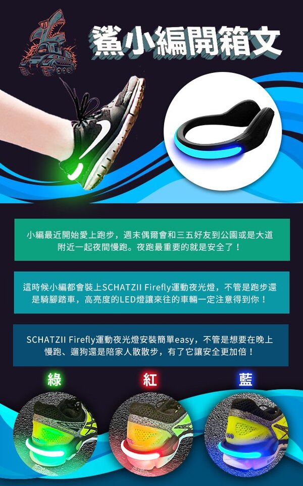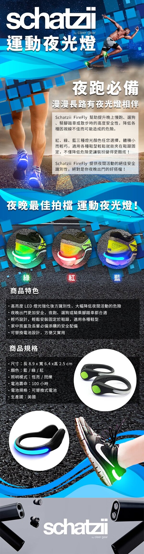 FireFly 幫助喜歡在晚上慢跑、遛狗、騎腳踏車或散步的人能輕易的被看到,降低各種因視線不佳而可能造成的危險。設計上有紅,綠藍三種燈色,體積不大且輕,輕鬆的就能夾在鞋跟,不僅降低危險更讓你的裝扮變得更酷炫。燈可選擇一直亮,閃亮。電池更可用到 100 小時再替換。FireFly 運動夜光燈絕對是你夜晚出門的好拍檔。