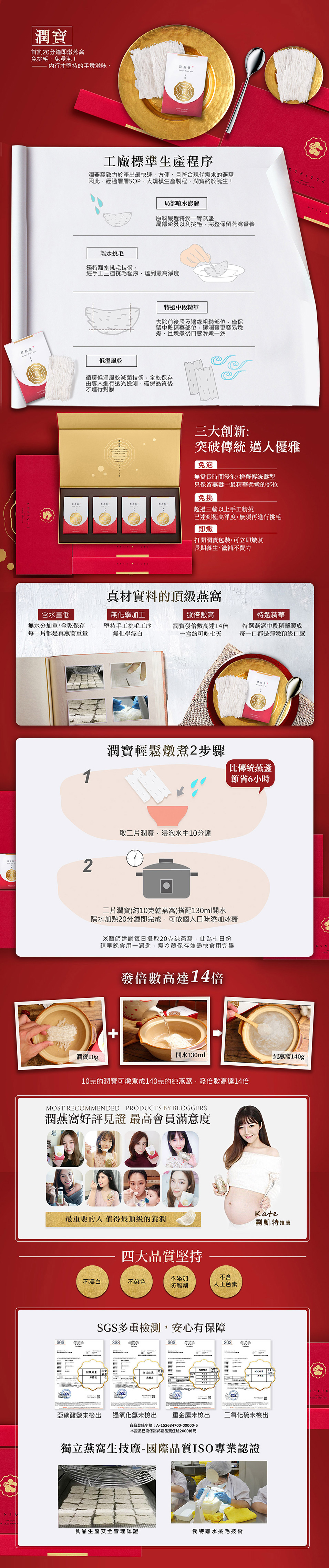 嚴選來自馬來西亞黃金區域「沙撈越」的特潤一等燕盞,馬來西亞的原料出口時都必須經過當局的嚴格檢驗標準,原料成本相較於其他產地雖高出許多,但具有官方認可的品質保障。潤寶取自燕窩的精華粗絲部位而成,經過層層SOP加工處理,已達到最高淨度,免挑毛、免長時間浸泡,20分鐘輕鬆燉煮完成,享受幸福滋味超簡單!