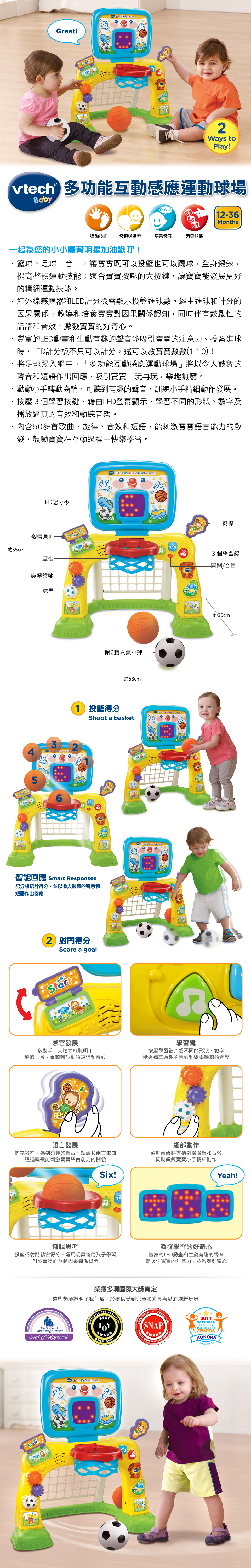 ●籃球、足球二合一,讓寶寶既可以投籃也可以踢球,全身鍛鍊,提高整體運動技能;適合寶寶按壓的大按鍵,讓寶寶能發展更好的精細運動技能。