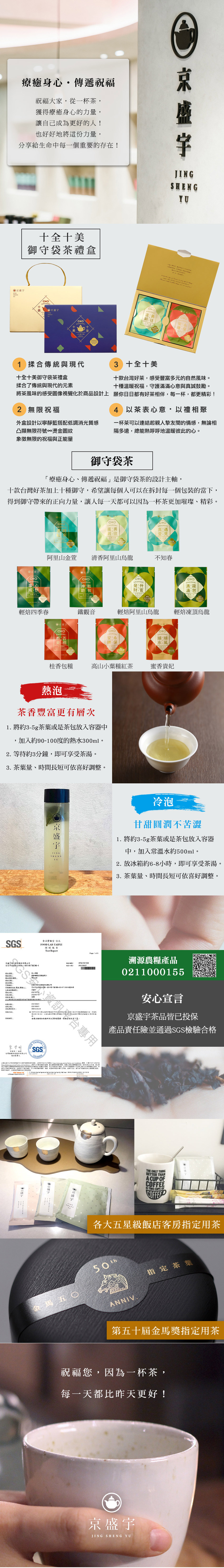 商品品名:十全十美御守袋茶禮盒組合/規格:10入茶包/盒重量:不知春3g x 1 阿里山金萱3g x 1 清香阿里山烏龍3g x 1 輕焙四季春2.5g x 1 輕焙凍頂烏龍2.5g x 1 輕焙阿里山烏龍2.5g x 1 鐵觀音2.5g x 1 桂香包種2g x 1 高山小葉種紅茶2.5g x 1 蜜香貴妃2.5g x 1內容物成分:茶葉原產地(國):台灣食品添加物名稱:無保存期限:2年投保產品責任險字號:新安產險/17225字第11ML000168號※依「得免營養標示之包裝食品規定」未有營養稱、沖泡用且未含其他原料或食品添加物之草木本植物及其花果種子之包裝食品,得免營養標示