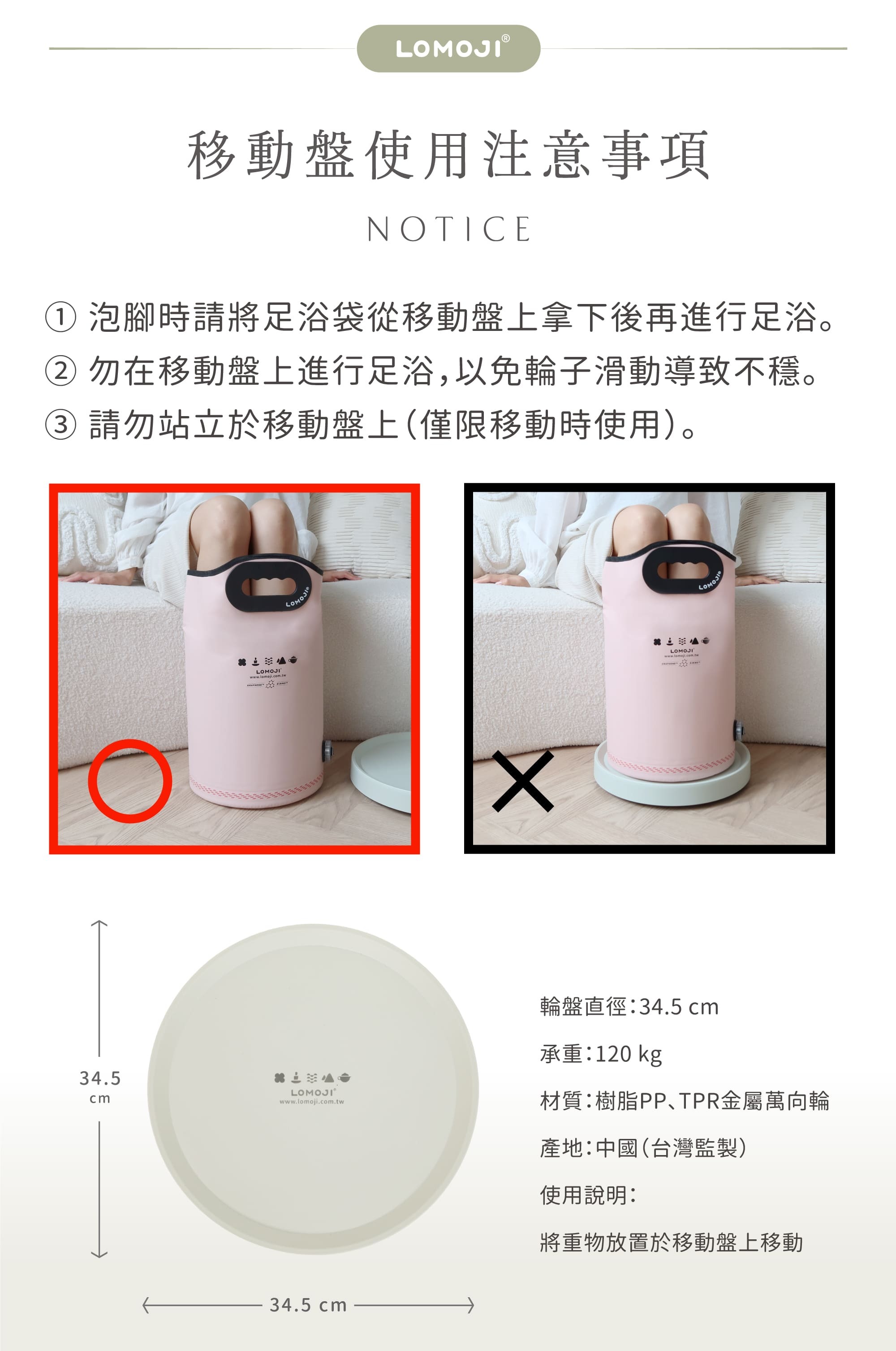2. 泡腳時請勿將足浴袋放在移動盤上
