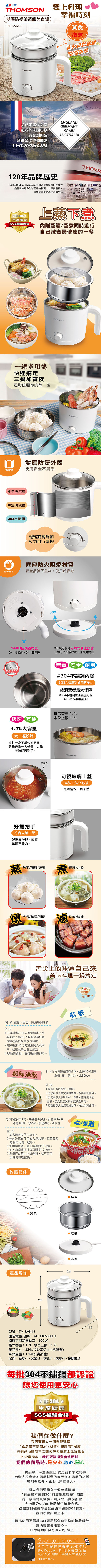 型號:TM-SAK43商檢合格字號:CI338065993474顏色:白使用電源:AC 110V /60Hz 消耗功率:600W商品材質:304不鏽鋼內膽、外殼PP材質單品重量:1.14Kg單品尺寸(mm):224X169X237彩盒尺寸(mm):255X215X220配件:304不銹鋼蒸架*1、304不鏽鋼蒸籠*1、底座*1、說明書(含保證書)*1國際條碼:4711467079701