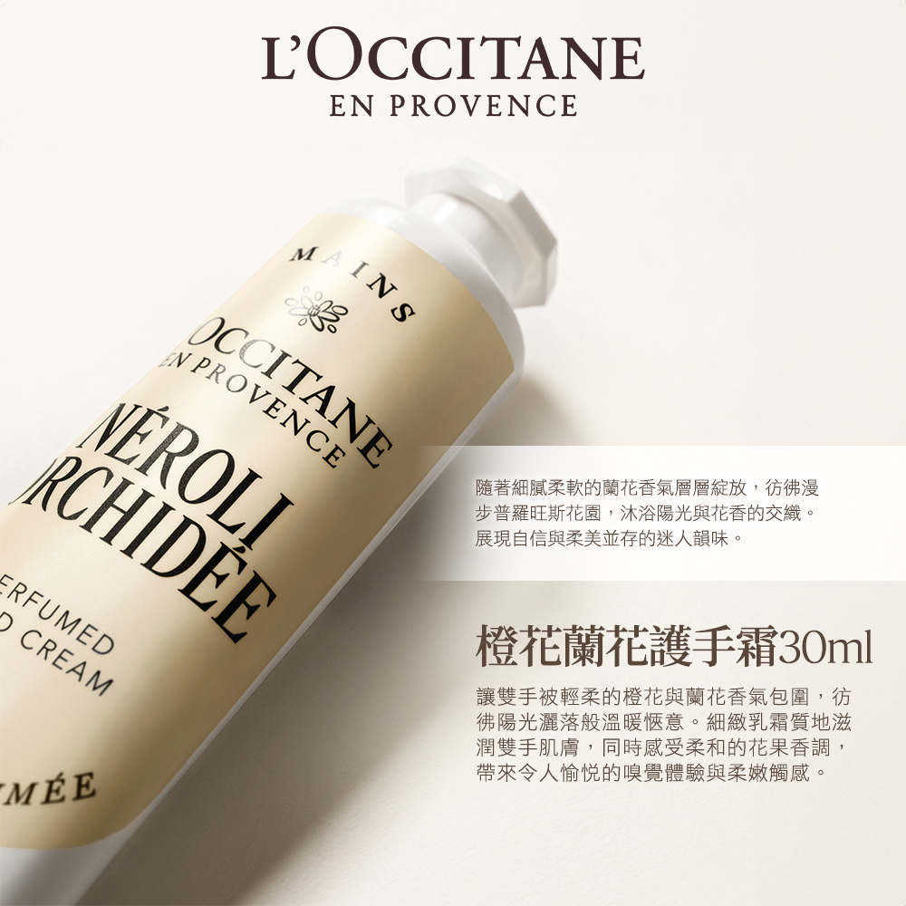 細緻乳霜質地滋潤雙手肌膚,同時感受柔和的花果香調,帶來令人愉悅的嗅覺體驗與柔嫩觸感。 讓雙手被輕柔的橙花與蘭花香氣包圍,彷彿陽光灑落般溫暖愜意。