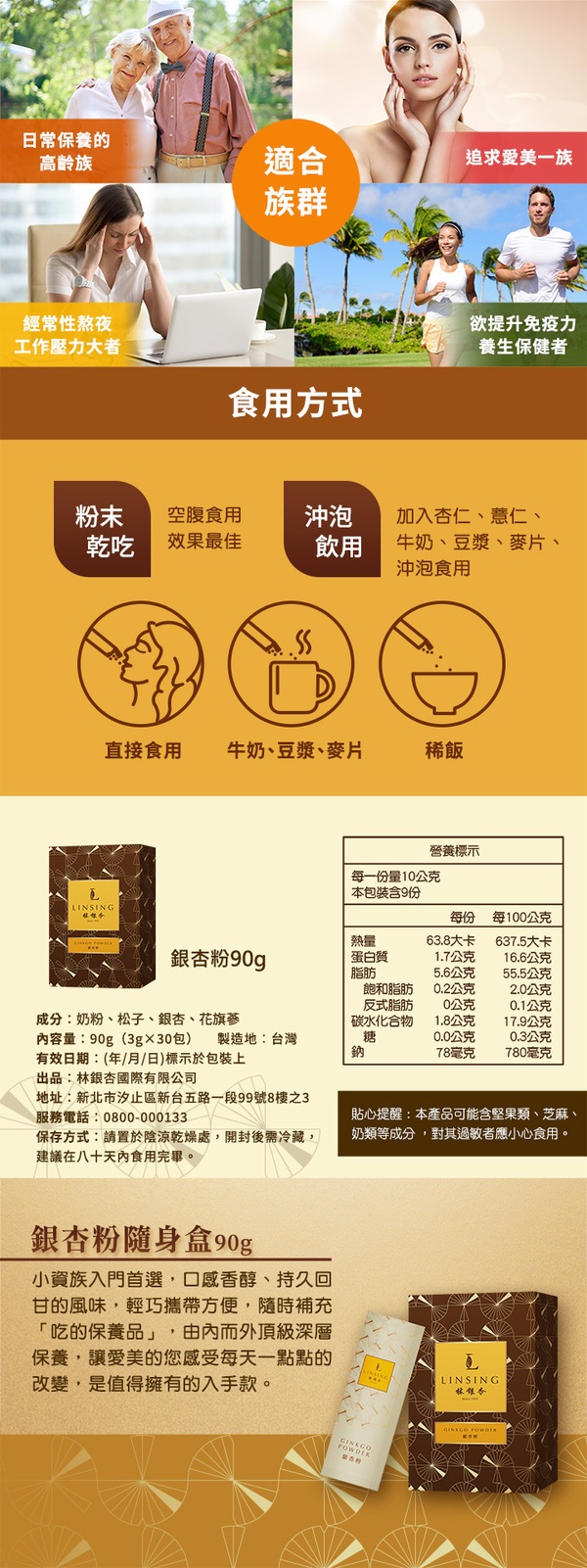 |容量規格|容量規格: 90g(3gX30包) 產品成份:奶粉、松子、銀杏、花旗蔘、二氧化矽保存期限:12個月