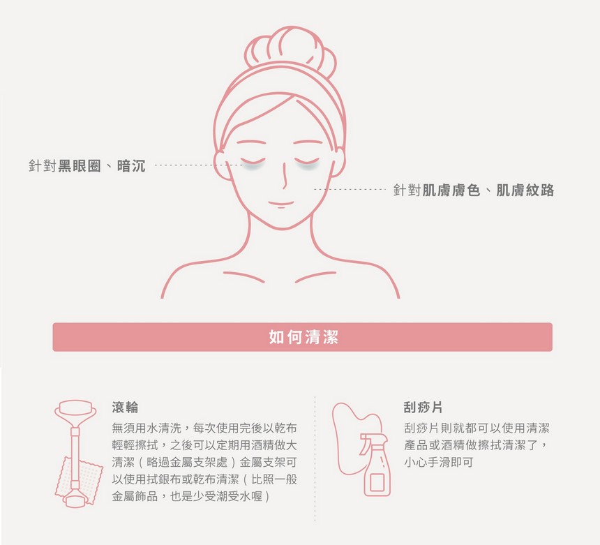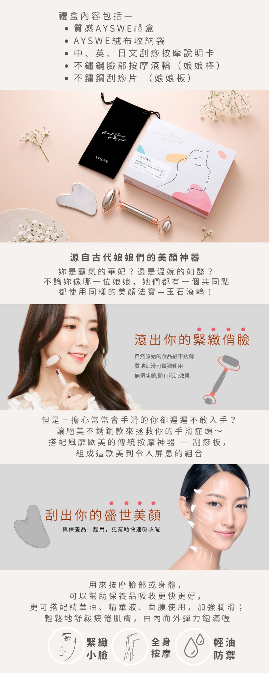 玉石滾輪是《甄嬛傳》華妃、《如懿傳》裡如懿的美顏法寶!我們為你把它變時尚了;嚴選食品級耐蝕、不怕手滑的不銹鋼,讓你按摩無後顧之憂, 以不銹鋼滾輪或刮痧板來按摩,幫助保養品吸收更快更好,更可搭配精華油、精華液、面膜使用,輕鬆地舒緩疲倦肌膚