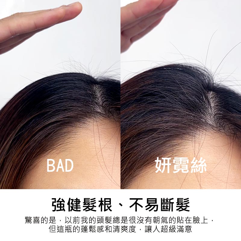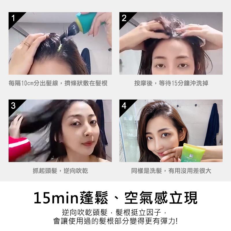 乾髮時,間隔10公分塗抹於頭皮,再用指腹輕揉按摩停留15分鐘後,清水沖洗掉,再用洗髮精洗頭;吹整頭髮時建議逆向吹髮,讓髮根挺立持久度更好