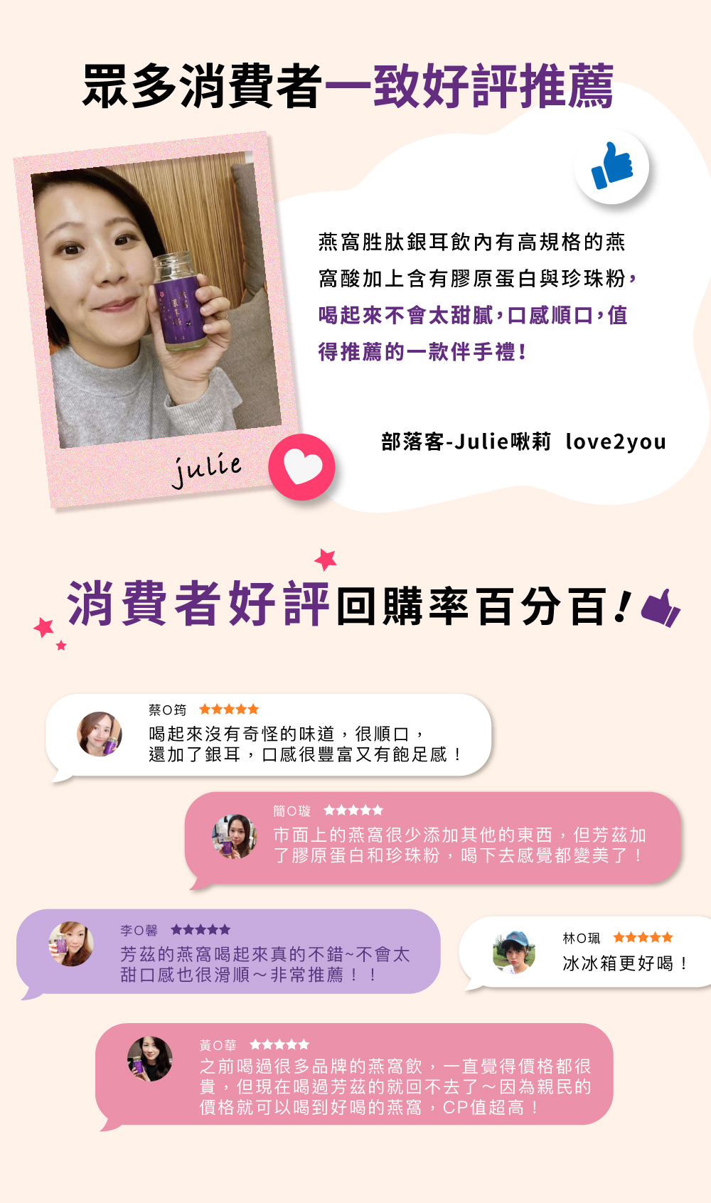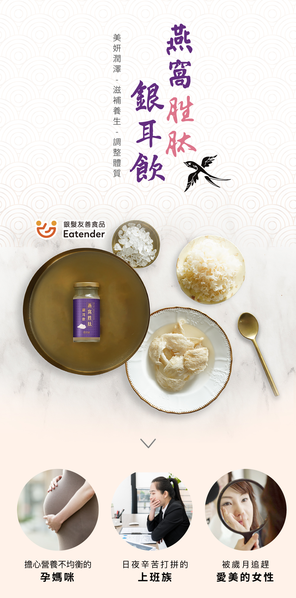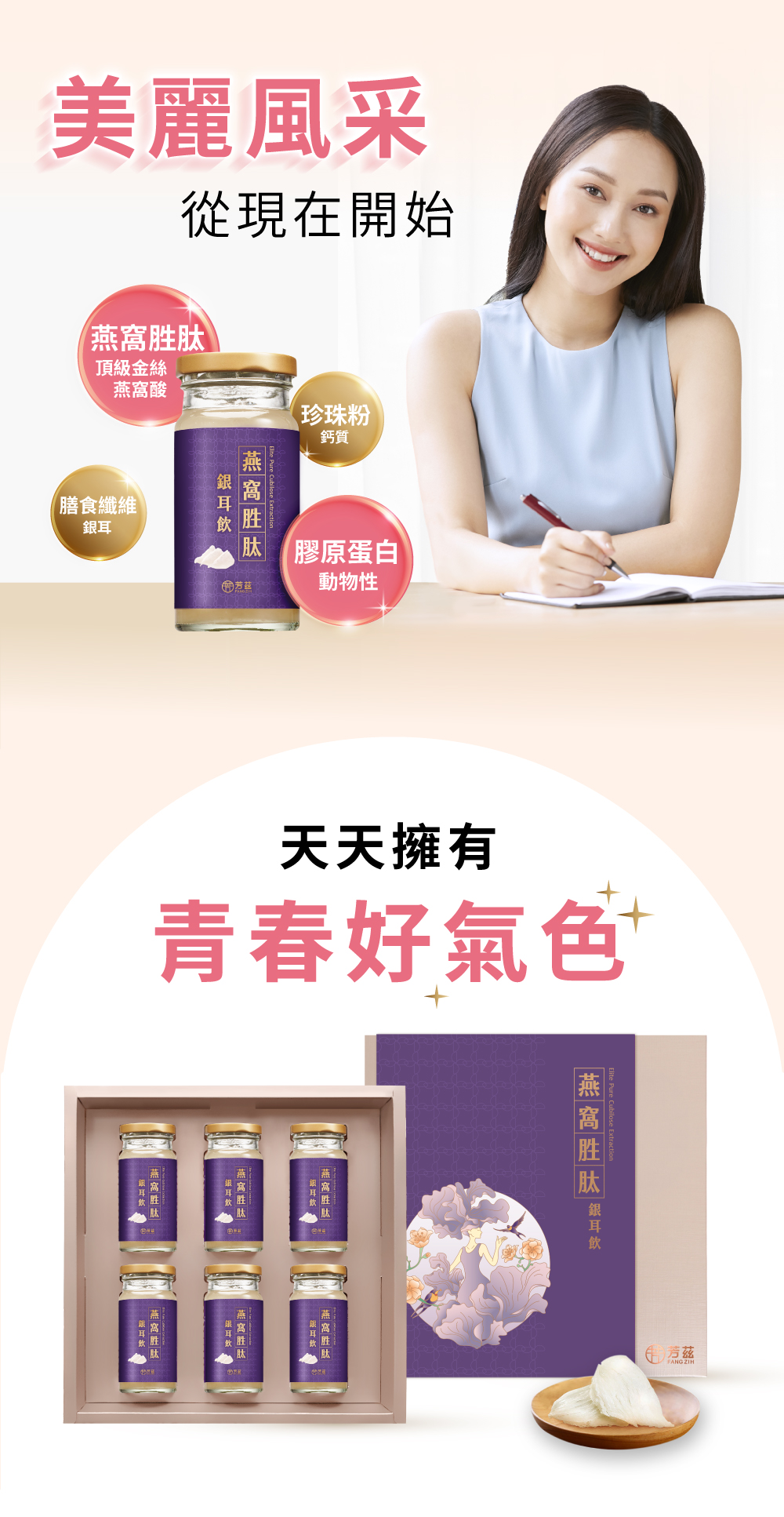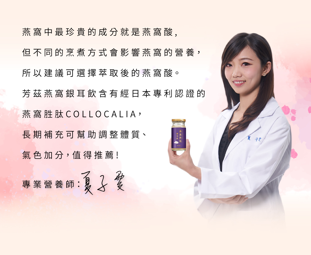 .日本3大專利頂級燕窩,美麗0死角.膠原蛋白,維持青春好氣色.台灣專利銀耳,含膳食纖維幫助消化.7,000目微米級珍珠粉,幫助入睡