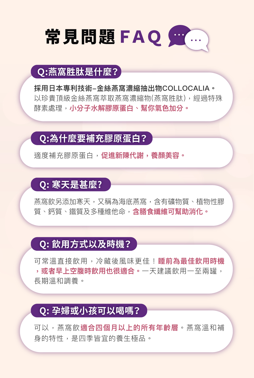 成分:水、冰糖、銀耳、燕窩抽出物(含燕窩酸)、珍珠粉、寒天粉、膠原蛋白