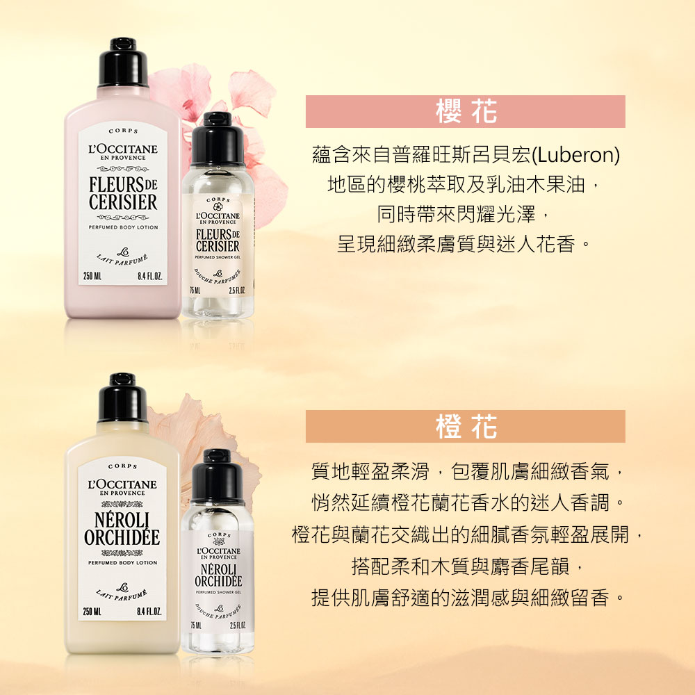 蘊含來自普羅旺斯呂貝宏(Luberon)地區的櫻桃萃取,洗後身體散發櫻花細緻香氣,享受沐浴時光同時感受春天氣息。