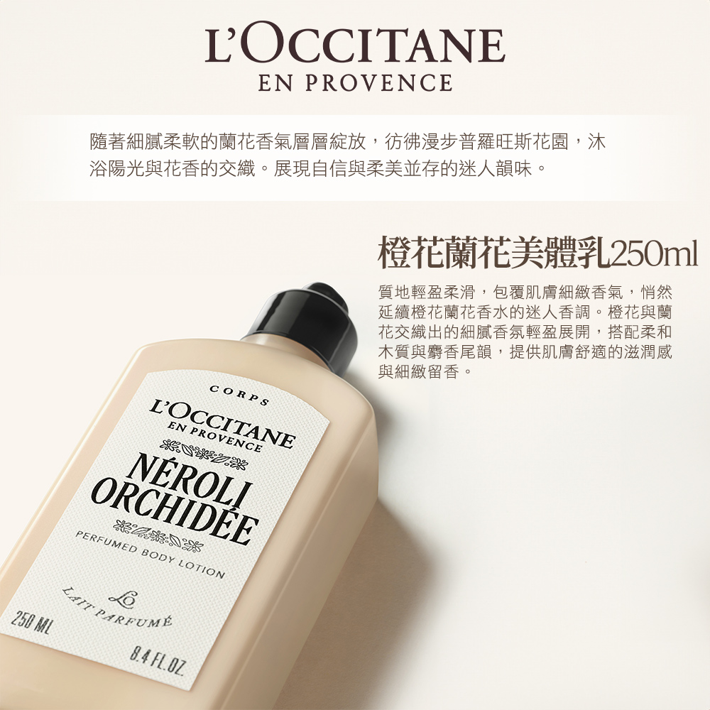 質地輕盈柔滑,包覆肌膚細緻香氣,悄然延續橙花蘭花香水的迷人香調。橙花與蘭花交織出的細膩香氛輕盈展開,搭配柔和木質與麝香尾韻,提供肌膚舒適的滋潤感與細緻留香。