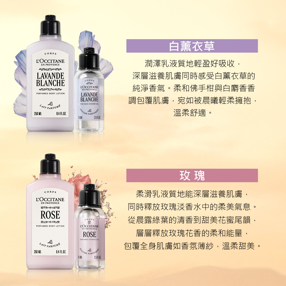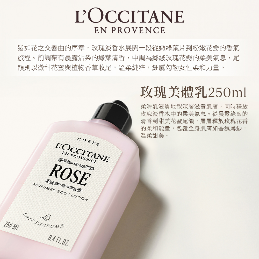 柔滑乳液質地能深層滋養肌膚,同時釋放玫瑰淡香水中的柔美氣息。從晨露綠葉的清香到甜美花蜜尾韻,層層釋放玫瑰花香的柔和能量,包覆全身肌膚如香氛薄紗,溫柔甜美。