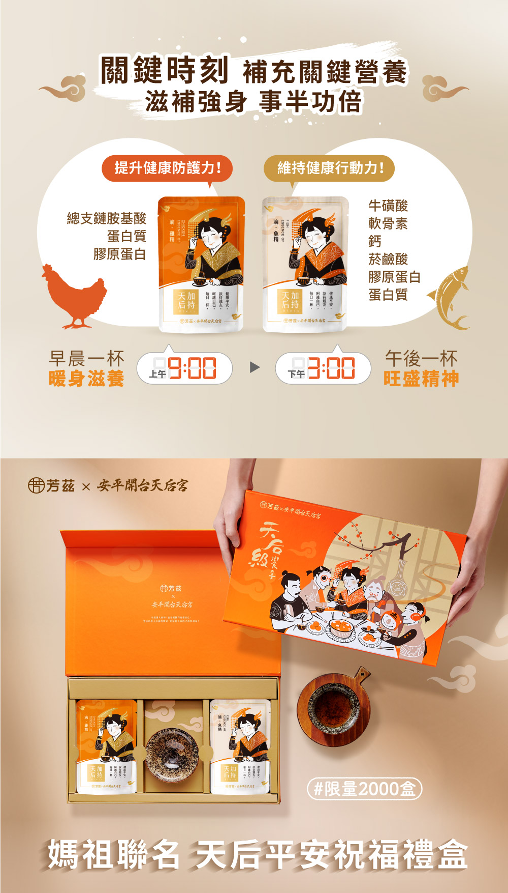 名稱:天后平安祝福禮盒(常溫)-滴魚精10包/盒,附贈限量加持御守、加持聖杯及天后聯名款專屬精美提袋。