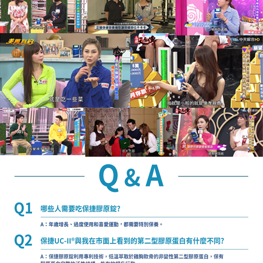 成分:微結晶纖維素、水解第二型膠原蛋白(雞胸軟骨)、非變性第二型膠原蛋白UC-ll®(雞胸軟骨、氯化鉀)、維生素C(維生素C、玉米澱粉)、硬脂酸鎂、二氧化矽