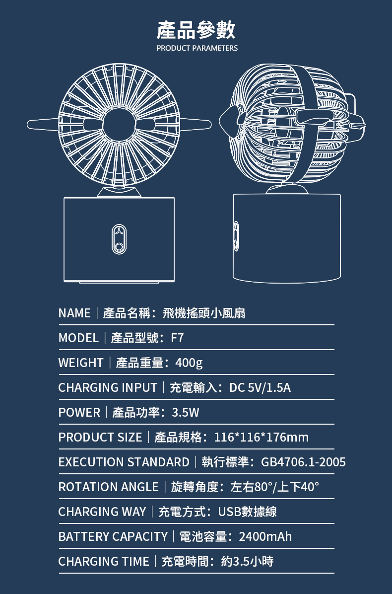 商品介紹商品內容產品名稱:【PowerRider】F7 飛機搖頭風扇產品重量:400g充電輸入:DC 5V/1.5A產品功率:3.5W產品規格:116x116x176mm執行標準:GB4706.1-2005旋轉角度:左右80度/上下40度充電方式:USB數據線電池容量:2400mAh充電時間:約3.5小時配送辦法完成付款後會儘速使用本公司配合的物流寄出,出貨時間三日工作天(不含例假日)。注意事項・送禮訂單,若在成立訂單時未填寫收件者地址,收件者可以至「我的 / 我的禮物/ 點擊商品 / 填寫地址。若在成立訂單後10天內未填寫地址,則訂單將自動取消。退換貨說明・如欲退貨,您可透過LINE禮物 / 訂單下方 / 洽詢訂單問題,提出取消要求給供應商。・本商品無法提供換貨服務,如需其他商品請您重新購買。・凡商品本身之問題 (例如無法連線、沒有聲音、寄錯商品等) 皆可於七日內申請換貨一次,並限換同一件商品。請保持商品的原始狀態 (無髒汙、磨損毀壞、加工改造等) 與原始包裝 (內外包裝、提袋、贈品、發票等),勿直接將商品在無任何外箱或安全包裝下寄回:106台北市大安區安居街77號 美勢科技股份有限公司收。・對商品有任何疑慮,請與我們連絡,我們會立即為您處理。商家資訊公司名:美勢科技股份有限公司地址:106台北市大安區安居街77號統一編號:55757824客服電話:02-2733-9300服務時間:國定上班日10:00~18:00