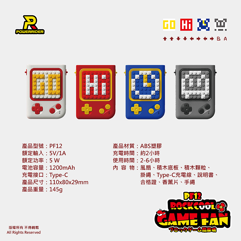 商品介紹商品內容產品名稱:【PowerRider】樂酷 積木遊戲多功能USB風扇產品型號:PF12產品材質:ABS塑膠額定輸入:5V/1A額定功率:5W電池容量:1200mAh充電接口:Type-C產品尺寸:110x80x29mm產品重量:145g充電時間:約2小時使用時間:2-6小時內容物:風扇、積木底板、積木顆粒、掛繩、Type-C充電線、說明書、合格證、香薰片、手繩配送辦法完成付款後會儘速使用本公司配合的物流寄出,出貨時間三日工作天(不含例假日)。注意事項・送禮訂單,若在成立訂單時未填寫收件者地址,收件者可以至「我的 / 我的禮物/ 點擊商品 / 填寫地址。若在成立訂單後10天內未填寫地址,則訂單將自動取消。退換貨說明・如欲退貨,您可透過LINE禮物 / 訂單下方 / 洽詢訂單問題,提出取消要求給供應商。・本商品無法提供換貨服務,如需其他商品請您重新購買。・凡商品本身之問題 (例如無法連線、沒有聲音、寄錯商品等) 皆可於七日內申請換貨一次,並限換同一件商品。請保持商品的原始狀態 (無髒汙、磨損毀壞、加工改造等) 與原始包裝 (內外包裝、提袋、贈品、發票等),勿直接將商品在無任何外箱或安全包裝下寄回:106台北市大安區安居街77號 美勢科技股份有限公司收。・對商品有任何疑慮,請與我們連絡,我們會立即為您處理。商家資訊公司名:美勢科技股份有限公司地址:106台北市大安區安居街77號統一編號:55757824客服電話:02-2733-9300服務時間:國定上班日10:00~18:00