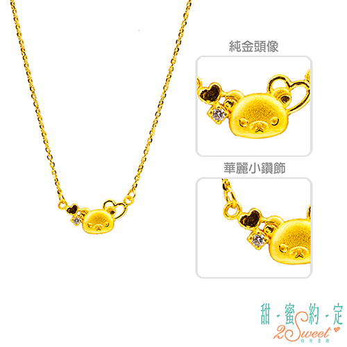 商品介紹商品內容黃金總重量(約):約0.85錢(3.19g)(±0.10錢)。墜飾尺寸(cm):主題約1.3cm x 0.7cm 。項鍊尺寸(cm):項鍊全長約40cm。其他材質說明:CZ晶鑽。商品包裝配件:拉拉熊原廠授權包裝盒、拉拉熊包裝袋、拉拉熊保證卡。備註1:此商品由甜蜜約定特約經銷商出貨。配送辦法
