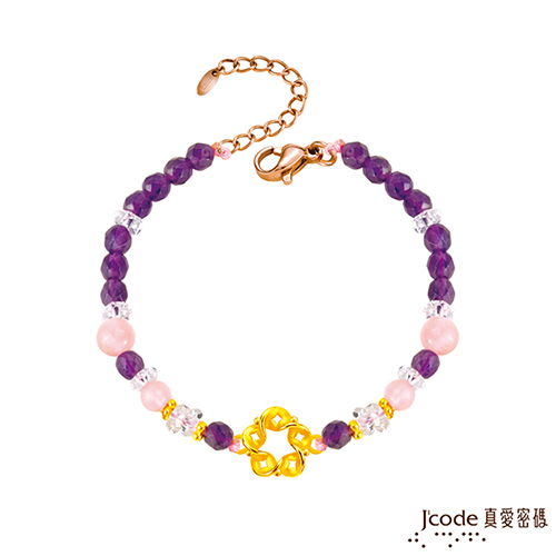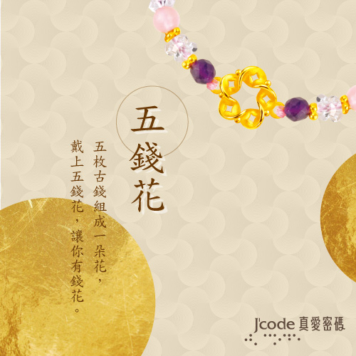 商品介紹【五錢花系列】五枚古錢一朵花,五錢花,有錢花。9999純金完美製作。開運贈禮、生日禮物首選。抗氧化,佩戴不過敏。保值黃金,送禮自用兩相宜。商品內容黃金總重量(約):約0.35錢(1.31g)(±0.10錢)。墜飾尺寸(cm):主題約1.0cm x 1.0cm。手鍊尺寸(cm):手鍊全長約16~18cm,含預備鍊長度約3cm。其他材質說明:紫水晶(紫)、白水晶(白)、粉晶(粉)/棉繩。商品包裝配件:真愛密碼包裝盒、真愛密碼包裝袋、真愛密碼保固卡。配送辦法