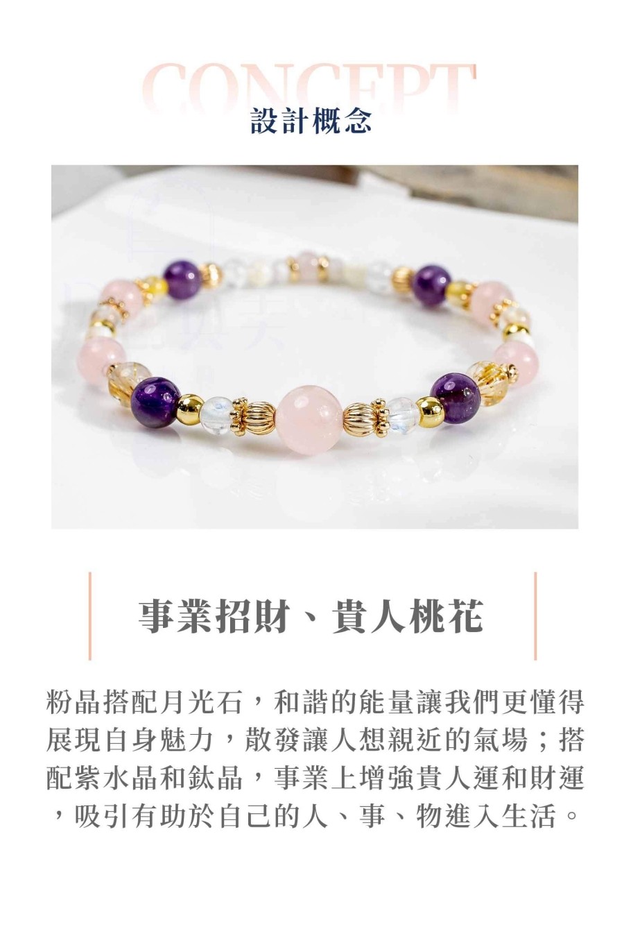 ・粉水晶、紫水晶、鈦晶、月光石、珍珠母貝