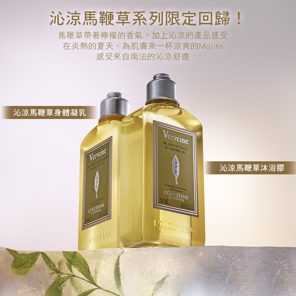 沁涼沐浴體驗 洗去炎熱疲憊!馬鞭草萃取帶著檸檬的香氣,加上沁涼的沐浴感受,在炎熱的夏天,洗去一天的悶熱疲憊,為肌膚來一杯涼爽的Mojito。