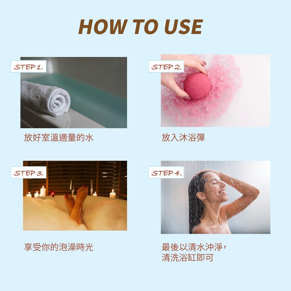 1. 將浴缸或浴桶放入適溫與適量的水。2. 撕開包裝膜,將沐浴彈放入水中等待溶解。3. 享受泡澡的樂趣,泡完以清水沖淨。*拆封後請立即使用