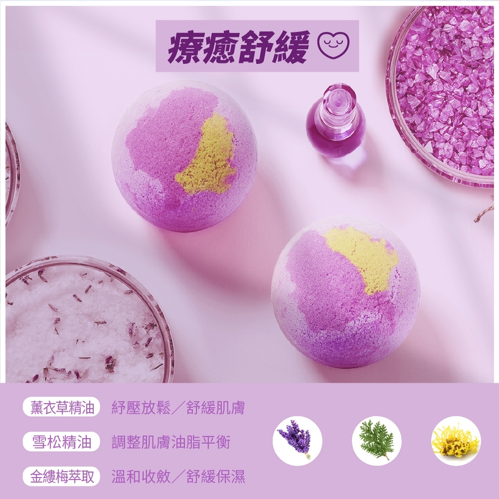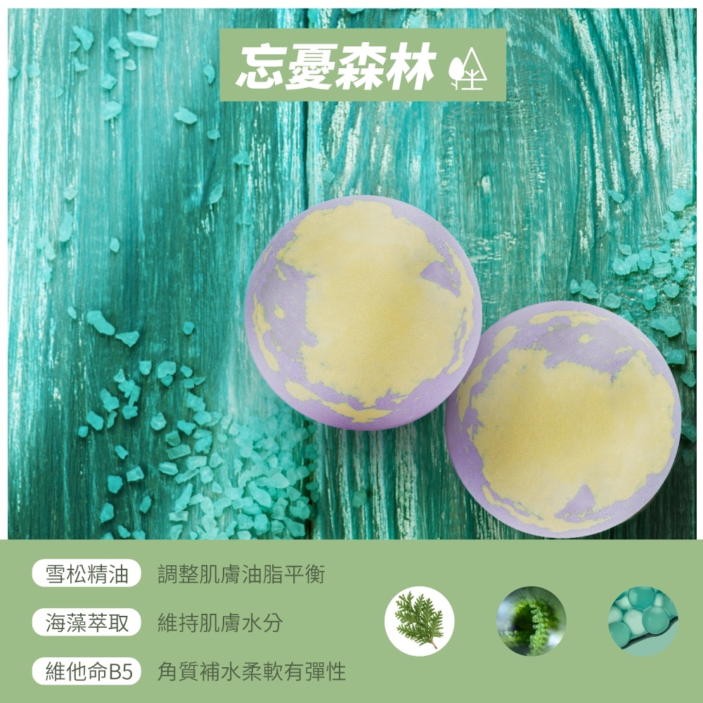 療癒舒緩:SODIUM BICARBONATE, CITRIC ACID, MAGNESIUM SULFATE, SODIUM SULFATE, HAMAMELIS VIRGINIANA (WITCH HAZEL) LEAF WATER, LAVANDULA ANGUSTIFOLIA (LAVENDER) OIL, CEDRUS ATLANTICA BARK OIL, FRAGRANCE, CI 45410, CI 19140, CI 42090果漾甜心:SODIUM BICARBONATE, CITRIC ACID, MAGNESIUM SULFATE, SODIUM SULFATE, SIMMONDSIA CHINENSIS (JOJOBA) SEED OIL, CITRUS PARADISI (GRAPEFRUIT) OIL, BETA VULGARIS (BEET) ROOT EXTRACT, HABERLEA RHODOPENSIS LEAF EXTRACT, YEAST EXTRACT, FRAGRANCE, CI 17200, CI 15985忘憂森林:SODIUM BICARBONATE, CITRIC ACID, MAGNESIUM SULFATE, SODIUM SULFATE, PANTHENOL, LAMINARIA SACCHARINA EXTRACT, CEDRUS ATLANTICA BARK OIL, FRAGRANCE, CI 19140, CI 42090天使之翼:SODIUM BICARBONATE, CITRIC ACID, MAGNESIUM SULFATE, SODIUM SULFATE, ALOE BARBADENSIS LEAF JUICE, TOCOPHERYL ACETATE, GLYCERIN, SODIUM HYALURONATE, FRAGRANCE, CI 42090,CI 16035