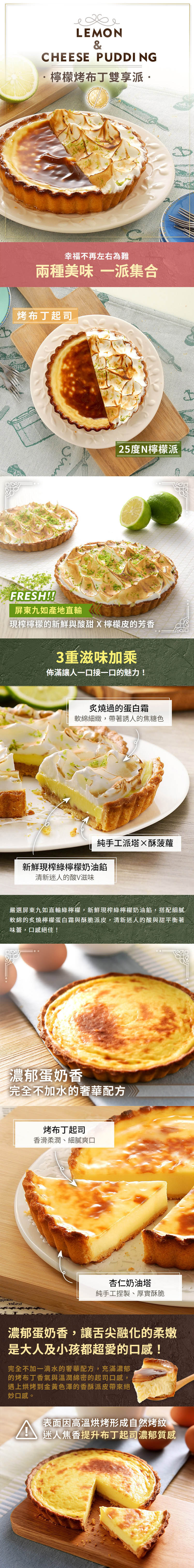 【檸檬派】酥菠蘿/新鮮檸檬奶油餡/檸檬蛋白霜/奶油派塔【烤布丁起司】鮮奶/奶油起司/蛋/奶油派塔葷素:奶蛋素規格: 6吋/盒保存期限:冷藏2~3天內食用完畢,實際保存期限請見包裝標示