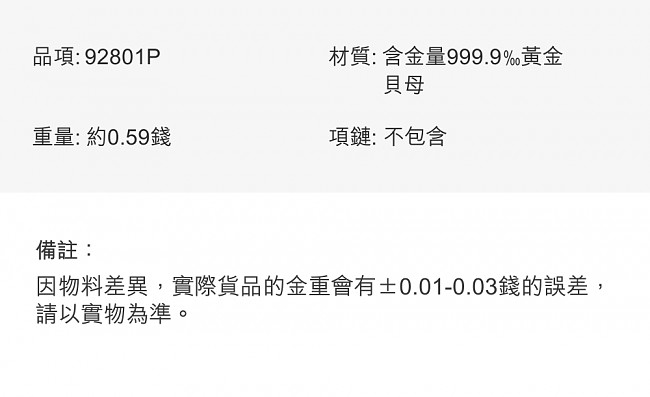 .999.9純金,完美製作 .象徵希望與吉祥 .此商品不含鍊 商品規格 ●款式:吊墜 ●款號:92801P ●材質:999.9黃金/貝母(貝殼)