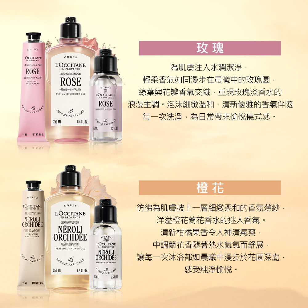 彷彿為肌膚披上一層細緻柔和的香氛薄紗,洋溢橙花蘭花香水的迷人香氣。清新柑橘果香令人神清氣爽,中調蘭花香隨著熱水氤氳而舒展,讓每一次沐浴都如晨曦中漫步於花園深處,感受純淨愉悅。