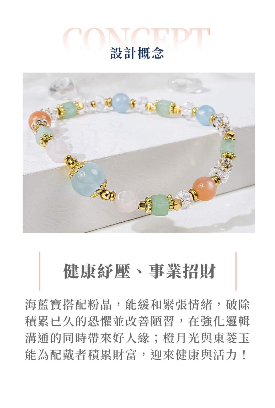 ・海藍寶、粉晶、綠東菱、橙月光石、白水晶