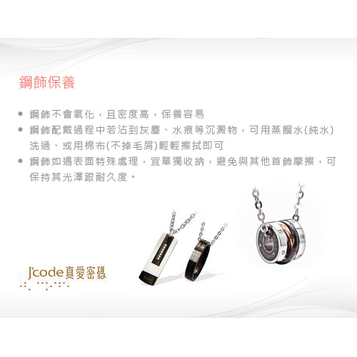 商品介紹商品內容墜飾尺寸(cm):男:約2.0cm x 3.0cm;女:約1.5cm x 1.7cm 。鍊子尺寸(cm):男:約50cm/女:約45cm(搭配之鋼鍊可能因電腦螢幕不同造成色差,以實際出貨為準)。鍊子材質:白鋼。其他材質說明:白鋼。商品包裝配件:真愛密碼包裝盒、真愛密碼包裝袋、真愛密碼保固卡。配送辦法