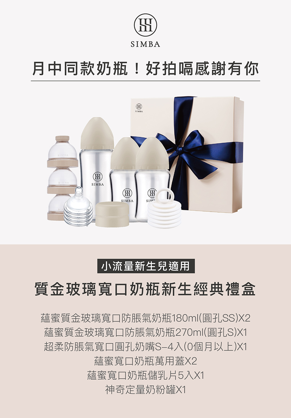 ● 內容物:蘊蜜質金玻璃寬口防脹氣奶瓶180ml(圓孔SS)X2+蘊蜜質金玻璃寬口防脹氣奶瓶270ml(圓孔S)1+超柔防脹氣寬口圓孔奶嘴S-4入(0個月以上)X1+蘊蜜寬口奶瓶萬用蓋X2+蘊蜜寬口奶瓶儲乳片5入X1+神奇定量奶粉罐X1