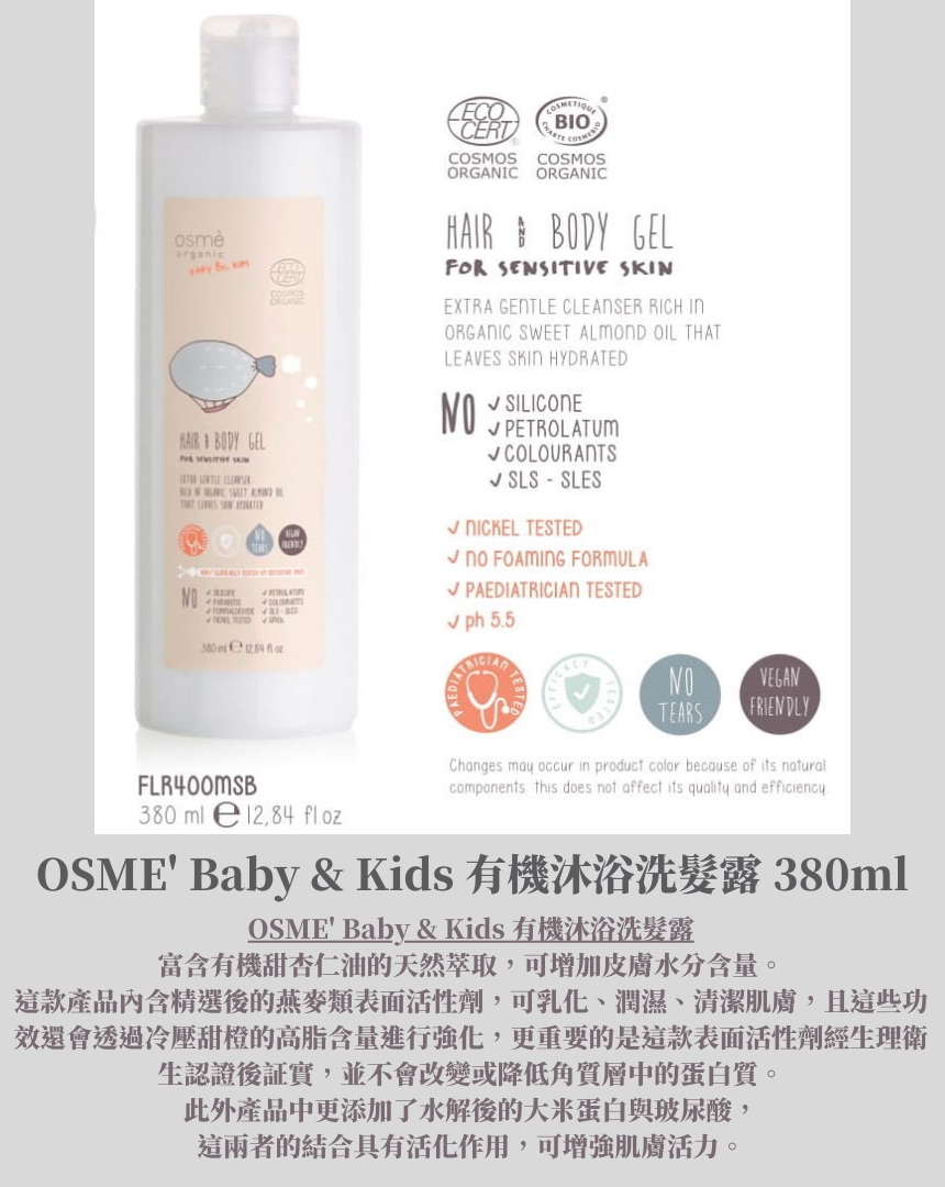 OSME' BABY有機沐浴洗髮露富含有機甜杏仁油的天然萃取,可增加皮膚水分含量。