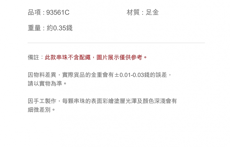 ‧款號:93561C‧材質:足金‧重量:約0.36錢 (貨品重量會有±0.05錢的誤差,請以實際商品為準)