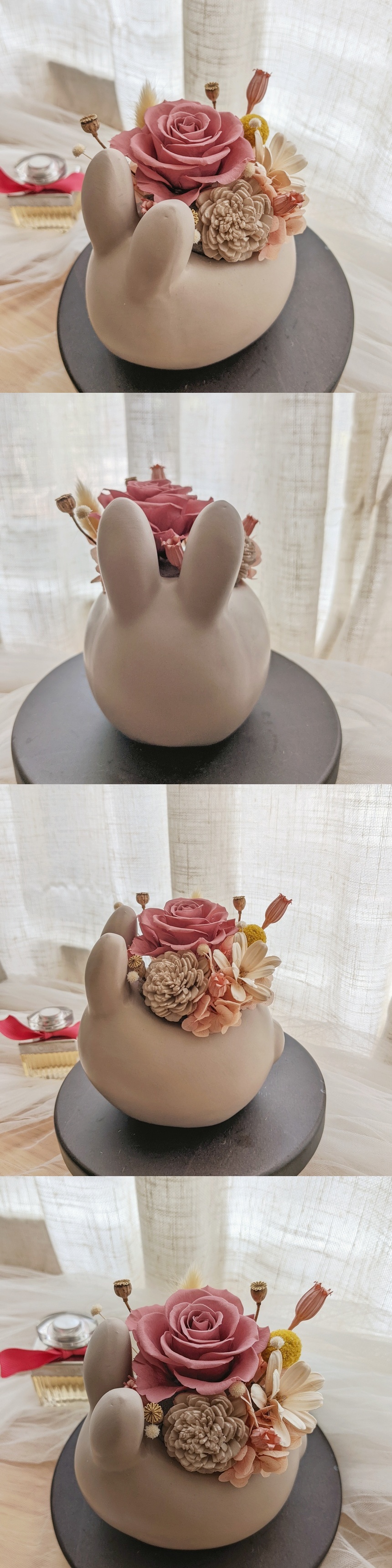 ✿兔兔:10×12×16公分,不大不小剛剛好✿花材:日本進口永生玫瑰、永生滿天星、不凋繡球、法國白梅、兔尾草、馴鹿苔、尤加利葉及其他花材 ✿包裝:雙層緞帶+透明PVC盒+牛皮紙包裝,儀式感滿滿