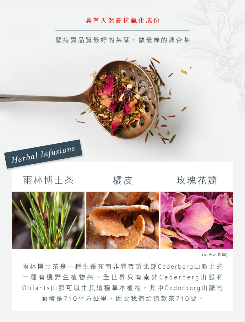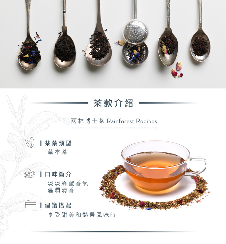 我們的 Rainforest Rooibos在採摘加熱後使得茶葉停止氧化等製作工序,而產出獨特的博士茶,