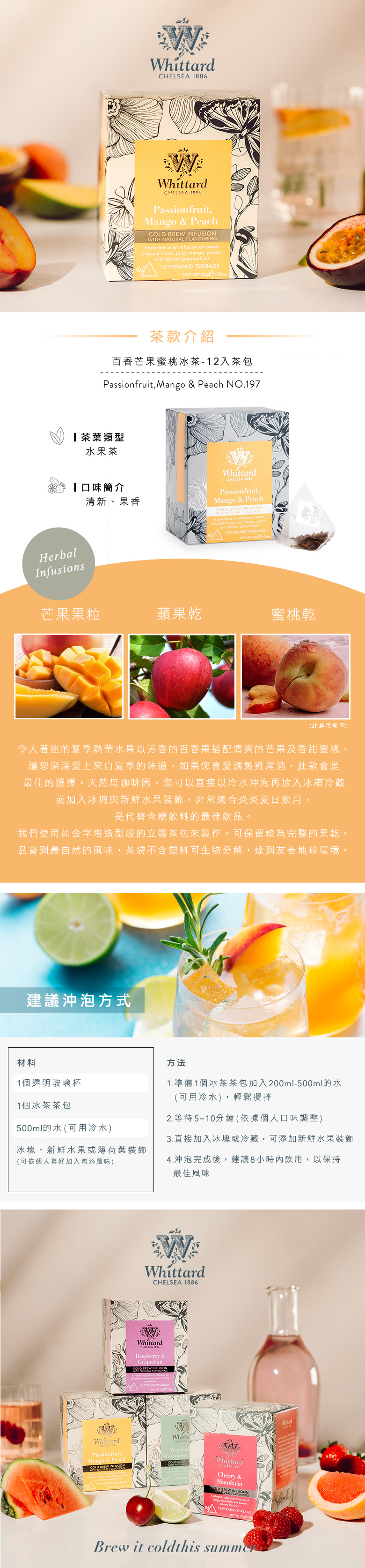 感受夏季的陽光,微風徐徐吹拂,喝著一杯特調的沁涼水果冰茶,希望您在炙熱的陽光下,盡情享受隨心所欲的生活!令人著迷的夏季熱帶水果以芳香的百香果搭配清爽的芒果及香甜蜜桃,讓您深深愛上來自夏季的味道,如果您喜愛調製雞尾酒,此款會是最佳的選擇。天然無咖啡因,您可以直接以冷水沖泡再放入冰箱冷藏或加入冰塊與新鮮水果裝飾,非常適合炎炎夏日飲用,是代替含糖飲料的最佳飲品。