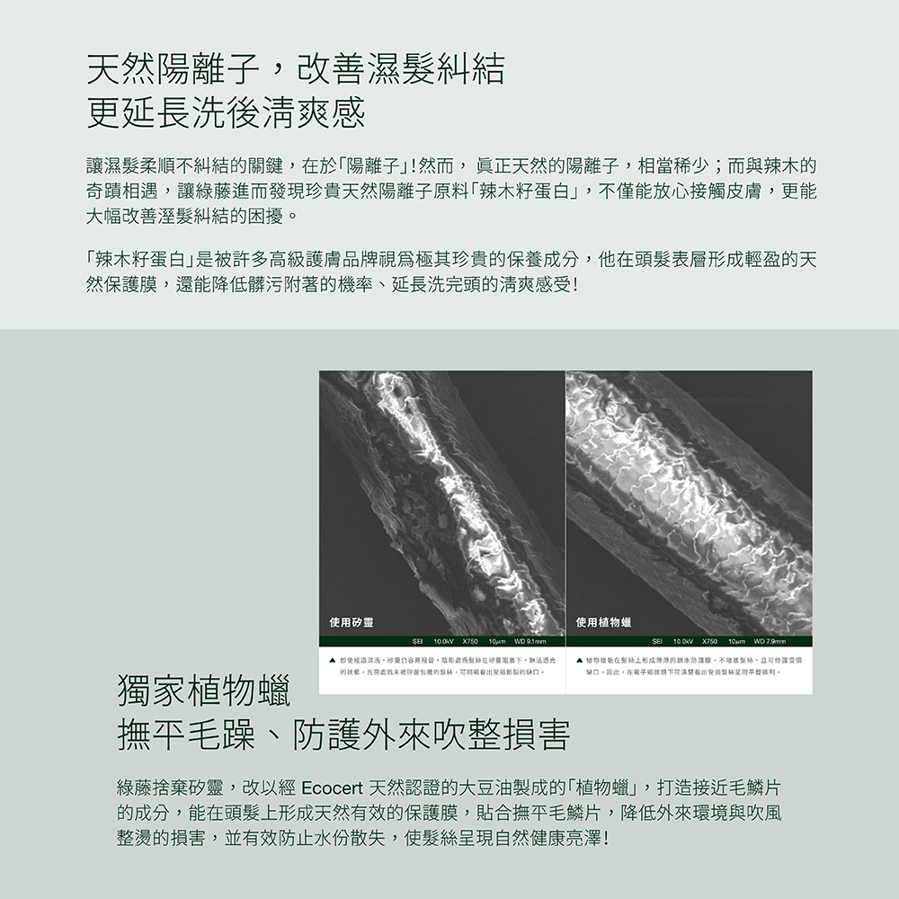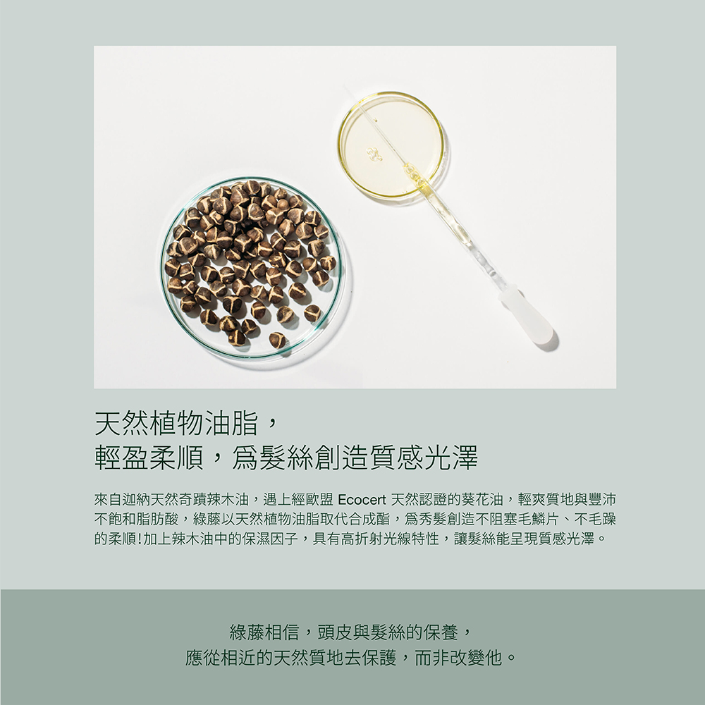以辣木籽蛋白取代合成陽離子,搭配獨家植物蠟,打造維護清爽蓬鬆的無矽靈潤髮,多些輕盈柔順,少些殘留與刺激。深入了解無須避開頭皮的天然溫和,揮別僅流於表象的滑順。