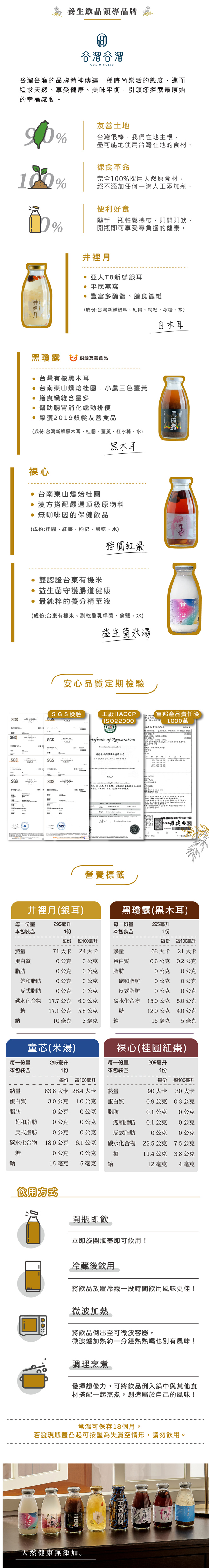商品成分:井裡月 ■亞大T8新鮮銀耳、枸杞、紅棗、冰糖、水 黑瓊露 ■彥廷農場新鮮黑木耳、台南東山燻焙桂圓、花蓮小農健康日記的三色薑黃、冰糖、水 裸心 ■台南東山柴燻桂圓、紅棗、黑糖、冰糖、水童芯 ■台東池上有機米、食鹽、益生菌、水