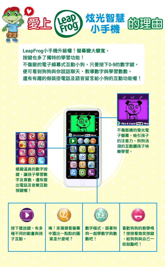 LeapFrog小手機升級囉!! 螢幕變大變寬,按鍵也多了獨特的學習功能!不傷眼的電子頻幕式互動小狗,只要按下1-10的數字鍵,便可看到狗狗與你說話聊天、教導數字與學習數數,還有有趣的假裝掛電話及語音留言給小狗的互動功能喔!