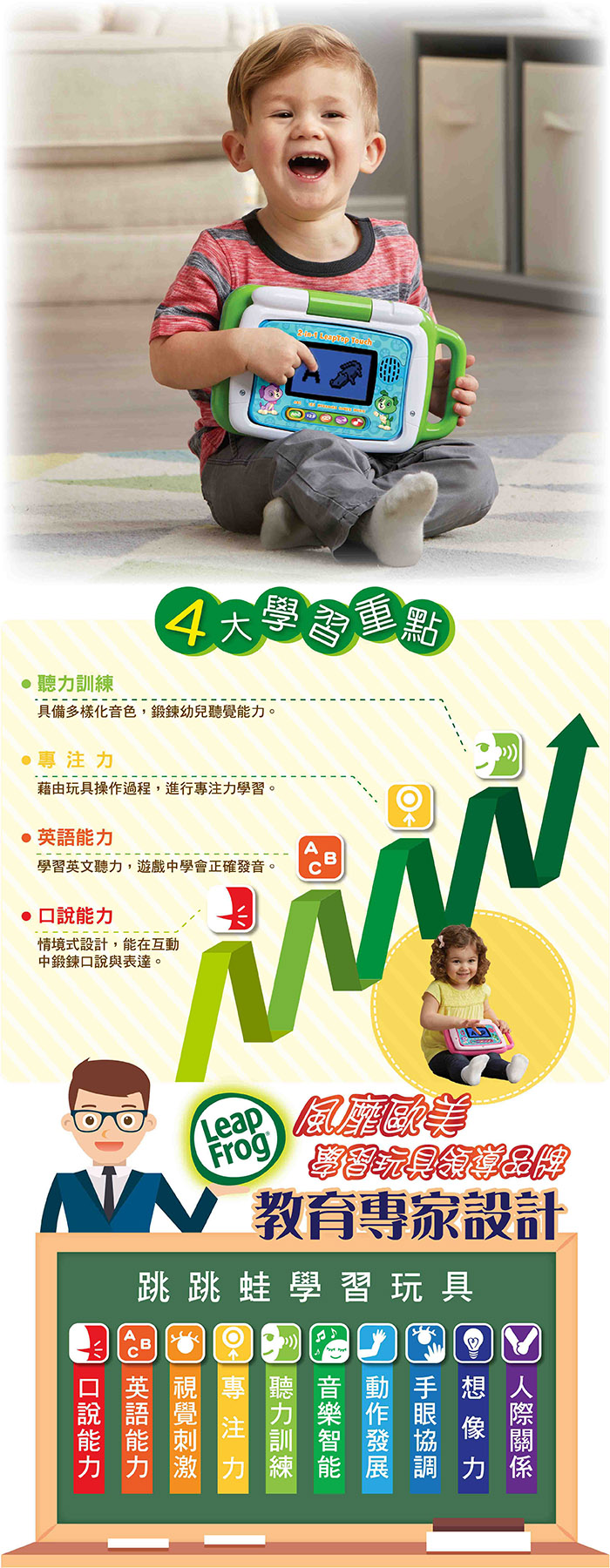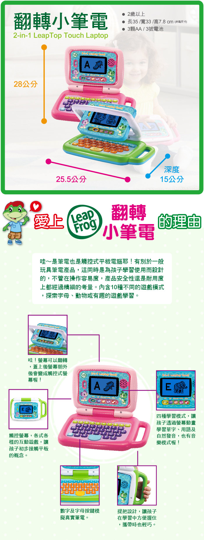 *學習主題-字母/數字/早期詞彙/動物*內含10種不同的遊戲模式*透過玩具,了解電腦基礎操作方式*手把方便携带*可觸控式螢幕