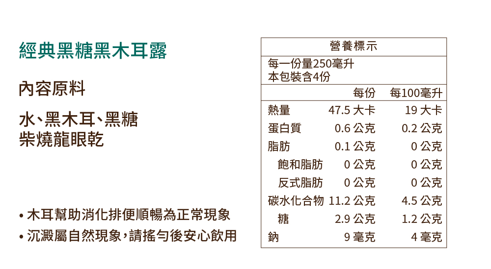 內容量:1000ml產品內容物:柴燒桂圓黑木耳露(無糖):水、黑木耳、柴燒龍眼乾經典黑糖黑木耳露:水、黑木耳、黑糖、柴燒龍眼乾紅棗黑木耳露:水、黑木耳、冰糖、大麥、紅棗、枸杞紅棗黑木耳露(無加糖):水、黑木耳、大麥、紅棗、枸杞