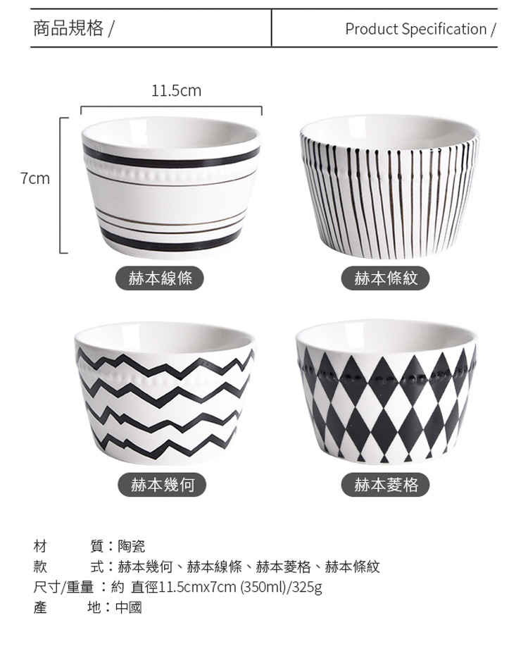 規格■材質:陶瓷■款式:赫本幾何/赫本線條/赫本菱格/赫本條紋■商品內容物: 赫本幾何x1+赫本線條x1+赫本菱格x1+赫本條紋x1■尺寸/重量 :約 直徑11.5cmx7cm (350ml)/325g■餐具禮盒組尺寸/重量:約 38cmx12.5cmx高12cm/1980g ■產地:中國