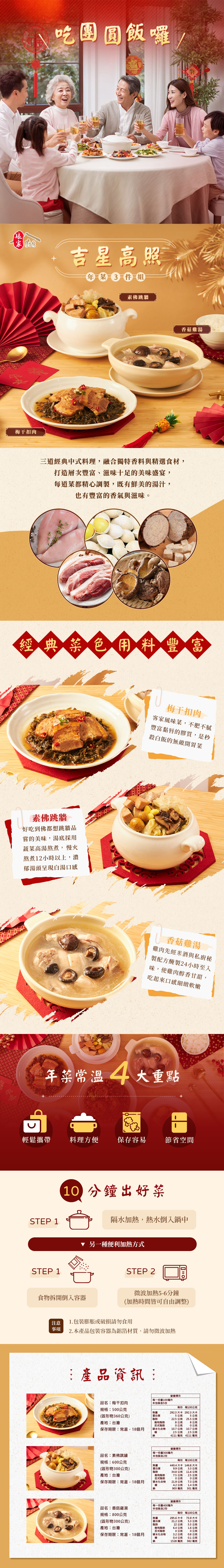 成份:香菇雞湯:水、雞肉、乾香菇、料理米酒、食鹽、味精、5'-次黃嘌呤核苷磷酸二鈉、5'-鳥嘌呤核苷磷酸二鈉。梅干扣肉:梅干菜、豬肉、水、大豆油、醬油、雞油、豬油、蒜、砂糖、蔥、辣椒、食鹽、味精、甘草、月桂葉、5'-次黃嘌呤核苷磷酸二鈉、5'-鳥嘌呤核苷磷酸二鈉素佛跳牆:水、大白菜、素火腿{組織狀大豆蛋白(大豆蛋白、玉米澱粉、小麥澱粉)、醬油(水、黃豆、食鹽、小麥)、大豆油、大豆蛋白、小麥蛋白、砂糖、酵母抽出物、紅麴粉、小麥纖維、醋酸澱粉、香料、調味劑(5'-次黃嘌呤核苷磷酸二鈉、5'-鳥嘌呤核苷磷酸二鈉)、酵素製劑(麥芽糊精、谷氨醯胺轉氨酶)}、芋頭、、大豆油、乾白木耳、乾香菇、栗子、醬油、馬鈴薯澱粉、銀杏(銀杏果、水、砂糖、食鹽、檸檬酸)、薑、砂糖、食鹽、味精、川芎、白胡椒粉、5'-次黃嘌呤核苷磷酸二鈉、5'-鳥嘌呤核苷磷酸二鈉。