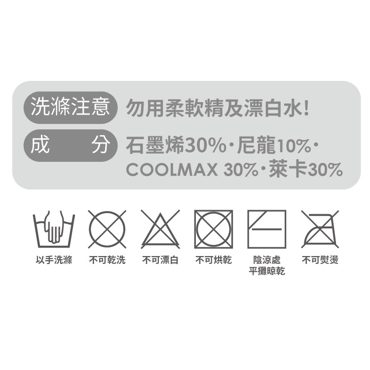 護腕成分:石墨烯30%、COOLMAX 30%、萊卡30%、尼龍10%